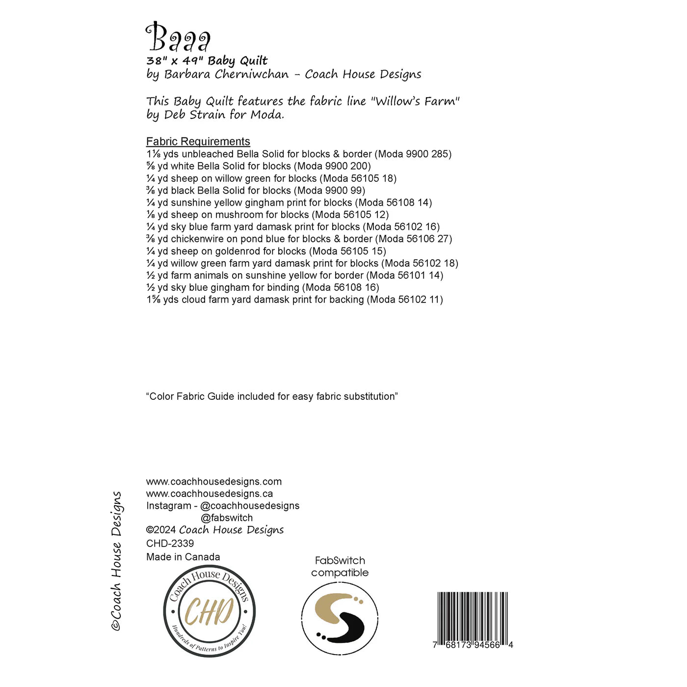 With a baa baa here and a baa baa there...This 38" x 49" baby quilt featuring the fabric line "Willow's Farm" by Deb Strain for Moda Fabrics. Perfect for the little one in your life, this quilt will have them snuggling up with sweet dreams.