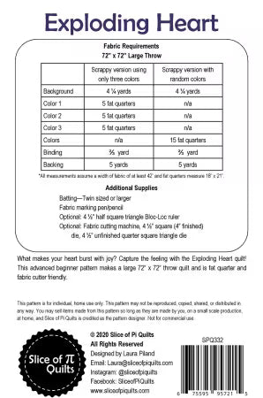 Whether you're an experienced quilter or just starting out, this pattern is sure to inspire you and bring you joy. Create a beautiful and unique quilt that captures the essence of what makes your heart sing with the Exploding Heart quilt pattern from Slice of Pi Quilts.