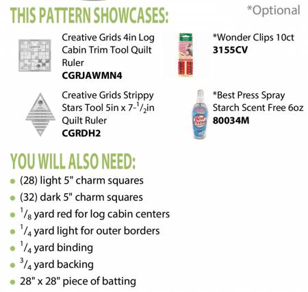 Don’t you love the way the border treatment accents the center design? That center design is made up of sixteen four-inch traditional log cabin blocks made with the Creative Grids Log Cabin Trim Tool for four-inch finished blocks. Because of the size of the finished blocks, all the logs can be cut from five-inch squares! Thirty-two dark and twenty-eight light squares will make the log cabins and the corner star units, just add the red center, borders, and binding.